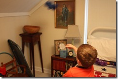 The bear toss game--Grandson Elijah and I take turns tossing little stuffed bears into a basket. He hasn’t wanted to play that in a long time until today. I thought he’d outgrown all the “baby” toys in the toy box upstairs, but lately he’s enjoyed getting back into that stuff like building things with the giant Legos blocks. Maybe he’s just feeling a little nostalgic for the old days or maybe the thrill of the video games has worn off. Finally. (That blue bear landed right inside the basket. He hasn’t lost his touch.)